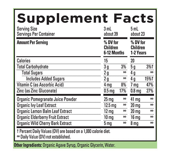 Organic Agave Syrup, Organic Glycerin, Water, Organic Pomegranate Juice Powder, Vitamin C, Organic Ivy Leaf Extract, Organic Lemon Balm Leaf Extract, Organic Elderberry Fruit Extract, Wild Cherry Bark Extract, and Zinc.